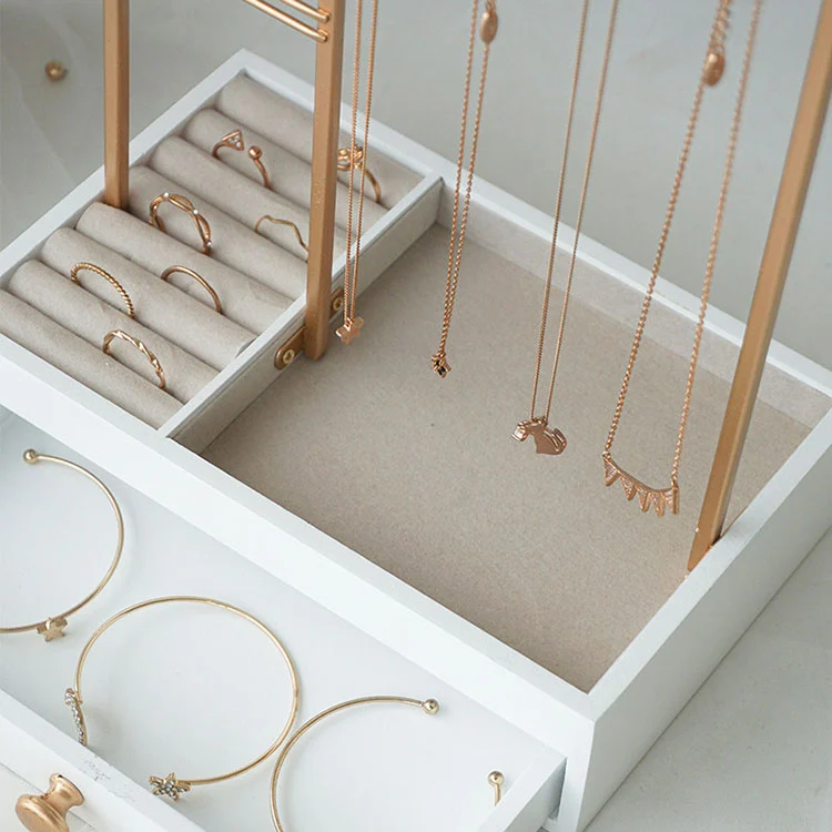 ພື້ນທີ່ສະແດງຊັ້ນເທິງເປີດ: ກອບໂລຫະສີທອງ, ເຫມາະສໍາລັບສາຍຄໍ, ຕຸ້ມຫູ, ແລະສາຍແຂນ. ມັນງ່າຍທີ່ຈະເບິ່ງແລະສາມາດເຂົ້າເຖິງໄດ້ຕາມຄວາມຕ້ອງການ.